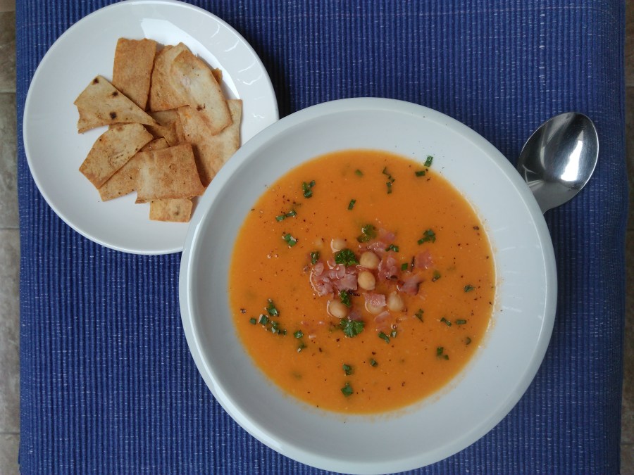 Na oleji si zpěníme cibui nakrájenou nadrobno. Pak přidáme nastrouhanou mrkev a celer, promícháme a chvíli osmahneme. Potom podlijeme, chvíli podusíme a pak přidáme cizrnu (pár kuliček si nechte na ozdobu) a rajčata z plechovky. Osolíme, opepříme, přidáme koření a dusíme doměkka. Když je vše měkké, tak mixérem polévku rozmixujeme, dochutíme a na talíři ozdobíme tou cizrnou a uškvařenou slaninou na kostičky.