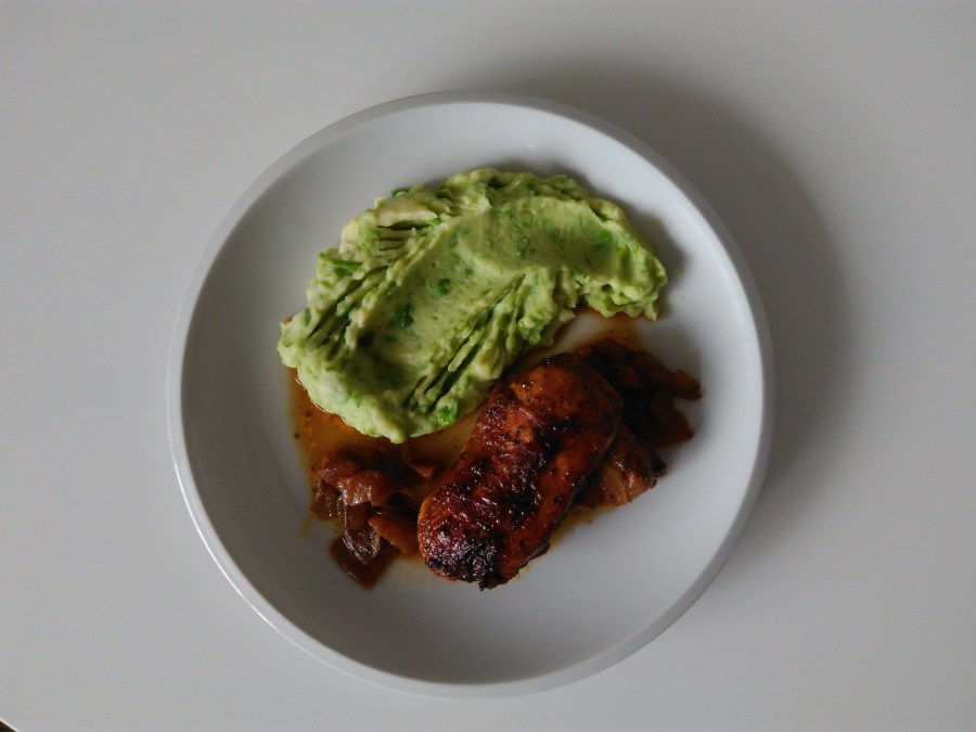 Jako příoha jsou vhodné brambory, kaše, rýže i těstoviny. Nebo stačí i kousek chleba. Já udělala bramborovou kaši se zeleným hráškem.