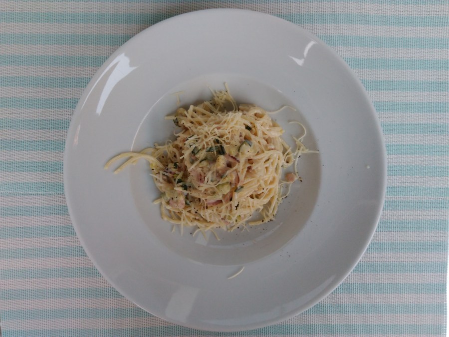 Slaninu nakrájíme na kostičky a rozškvařime v hluboké pánvi. Přidáme cibuli nakrájenou nadrobno a osmahneme. Pak přidáme drcený česnek a cuketu nakrajenou na malé kostičky. Zamícháme a necháme pomalu dodělat. Stačí chvilku. Osolíme, opepříme a dáme oregáno. Špagety uvaříme, scedíme a přidáme do směsi. Promícháme, můžeme přidat i trochu vody z uvařených špaget. Pak přidáme kysanou smetanu a polovinu sýra a zamícháme vše dohromady. Na talíři pak ještě posypeme sýrem.