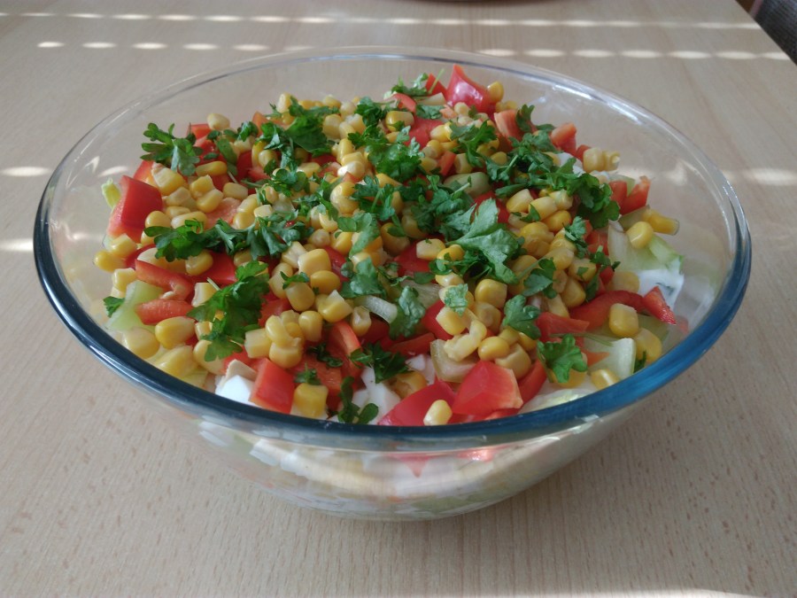 Zeleninu si omyjeme, očistíme a připravíme. Salát natrháme, okurku a papriku nakrájíme na kostičky, rajčata na plátky, mrkev nastrouháme nahrubo. Postupně vrstvíme do mísy a prokáldáme dresinkem z kysané smetany (smetana + sůl + pepř). Na dno dáme ledový salát, na to rajčata, potřeme dresinkem, na to zase okurku, papriku, dresink, zase ledový salát, mrkev, kukuřice a takto pokračujeme dokud nevypotřebujeme vše. Navrchu by měl být vždy dresink a na tom už jen jedna poslední vrstva. Dáme do lednice a podáváme později…