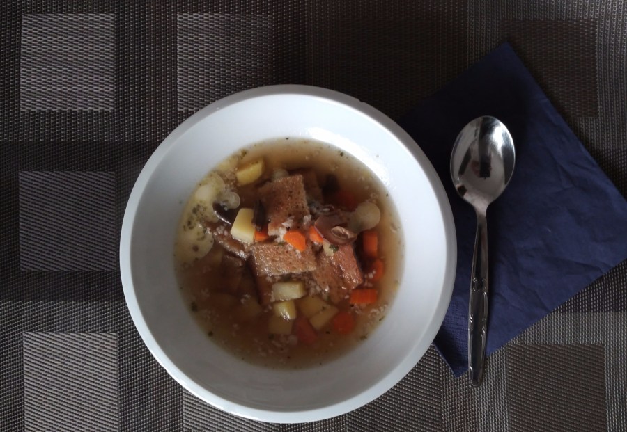 Do kastrůlku dáme sušené houby, na kostičky nakrájené oloupané brambory a mrkev, zalijeme vodou, přidáme kmín a osolíme, vaříme doměkka. Pak přidáme majoránku a případně ještě dochutíme. Krajíček chleba si opečeme, stačí v toustovači, nakrájíme na kousky a dáme do talíře, přidáme kousíček másla, rozetřený česnek podle chuti. Na porci alespoň 2 stroužky, aby to mělo ten účinek.