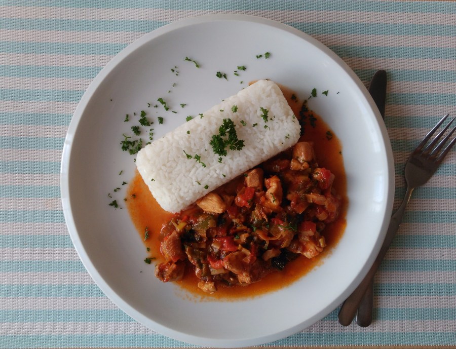Maso nakrájíme na kousky a naložíme do připravené marinády a to min. na půl hodiny před vařením. Pak na trošce oleje prudce opečeme maso, aby se zatáhlo. Přendáme do mísy a přidáme nakrájený pórek na kolečka, papriku na proužky a česnek na plátky. Prudce osmahneme a pak malinko podlijeme. Přidáme maso, promícháme, dáme k tomu nakrájená rajčata z plechovky, osolíme, dáme bobkový list a nové koření a malinko podlijeme. Dusíme jen chvíli, dokud není hotová zelenina. Nepodléváme moc, abychom to nemuseli pak zahušťovat. Podáváme s rýží, ale mohou být i těstoviny.