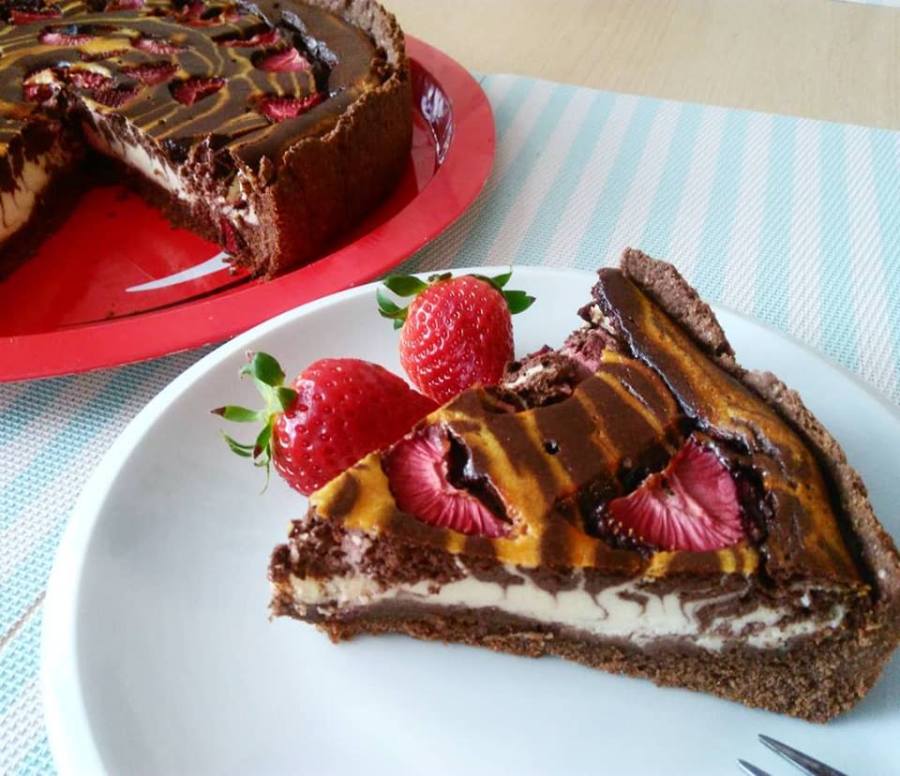 Ze surovin na těsto uděláme hladké těsto, které natlačíme do dortové formy s pečícím papírem. Uděláme vysoký okraj, asi 5 cm. Ze surovin na náplň uděláme hladkou směs. Rozdělíme na dvě části a do jedné přidáme kakao. Pak pomalu pod naběračkách lijeme do formy na těsto. Začínáme vždy od středu. Nakonec můžeme navrch dát nakrájené jahody. Pečeme ve vyhřáté troubě na 170°C asi půl hodiny a pak dalších asi 30 minut na 150°C.