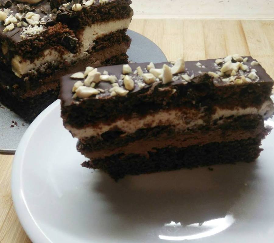 –>> Po vychladnutí potřeme spodní korpus čoko krémem, na to další těsto, které potřeme kešu krémem a navrch další těsto, které propíchneme špejlí na povrchu a pomalu poléváme rozpuštěnou čokoládou. Nakonec ozdobíme oříšky a čoko.