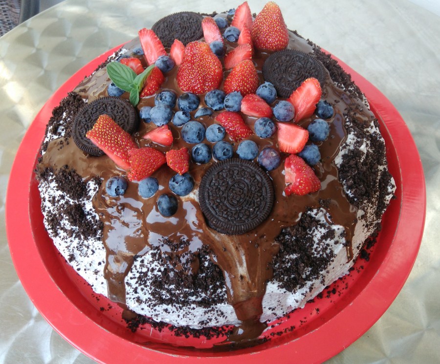 Šlehačku ušleháme, tvaroh smícháme s pudinkem, přidáme šlehačku a rozdrcené oreo sušenky ( trochu si necháme na ozdobu). Hotové těsto necháme vychladnout a pak rozkrojíme. Natřeme na něj hodně krému, na to dáme nakrájené jahody, na to zase krém a přiklopíme druhým korpusem. Celý dort potřeme krémem, polijeme čoko polevou a ozdobíme sušenkami.
