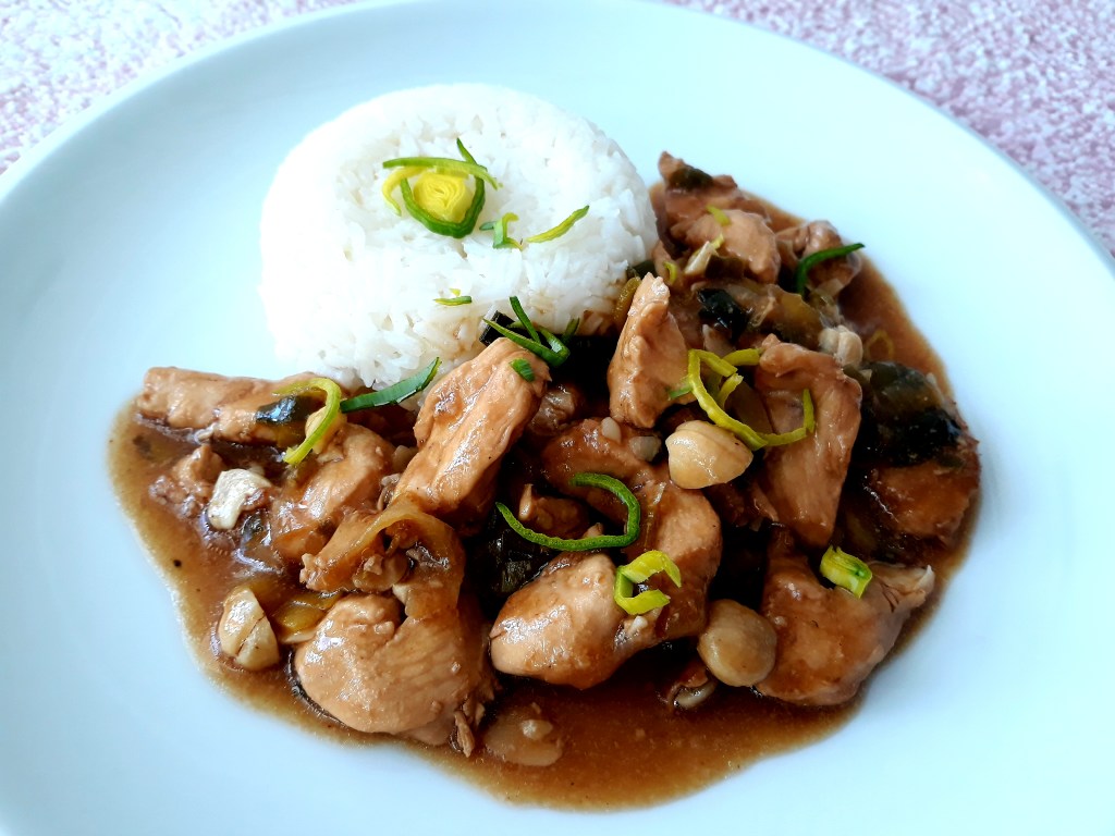 Nejdříve připravíme omáčku na maso, ve které necháme pak maso marinovat asi hodinu v lednici. Smícháme 1 lžíci vína, 1 lžíci sojovky, 1 lžíci oleje, 1 lžíci solamylu. Marinádu vetřeme do masa a necháme marinovat. Připravíme zatím omáčku: Smícháme zbytek vína, sojovky, octa, oleje a solamylu. Pórek nakrájíme na kolečka a přidáme do omáčky. Pak tam ještě dáme prolisovaný česnek. Kuřecí maso zprudka opečeme na pánvi, dokud se nezatáhne. Pak přidáme omáčku spolu s pórkem a povaříme krátce dokud nezhoustne. Nakonec přisypeme arašidy. Můžeme případně dochutit.