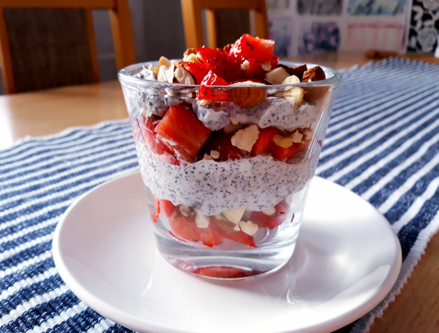 Pak budeme vrstvit do skleničky střídavě ovoce a tvaroh a ořechy.