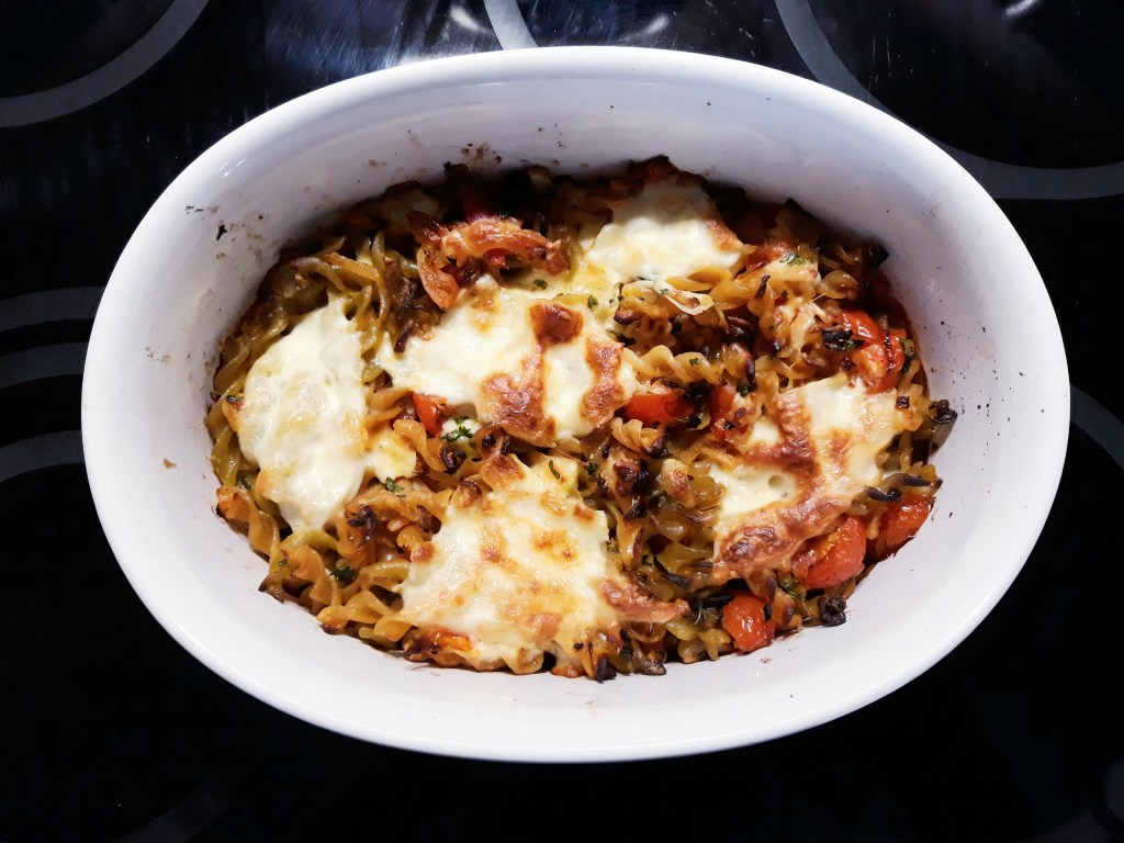 Na pánvi na olivovém oleji osmahneme nakrájenou cibuli a česnek. Pak přidáme nakrájená rajčata a dochutíme (sůl a pepř). Přidáme uvařené těstoviny a promícháme. Zakápneme ještě olivovým olejem. Polovinu mozzarelly nakrájíme na kostičky a vmícháme do těstovin spolu se zelenou petrželkou. Druhou polovinu nakrájíme na plátky a dáme stranou. Těstovinovou směs přendáme do zapékací mísy, navrch dáme plátky mozzarelly a krátce zapečeme.