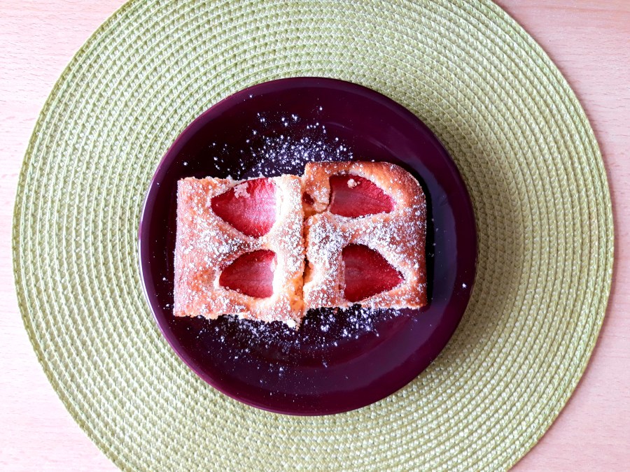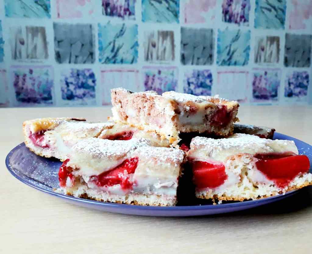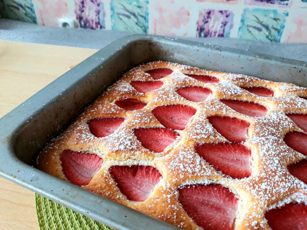 Jednoduchý 😀😁 Vše smícháme a vznikne nám těsto, které nalijeme na vymazaný a vysypaný plech. Ja mám velikost asi 23×30 cm. Pokud je těsto moc husté, tak přidejte trochu mléka. Navrch poklademe jahody.