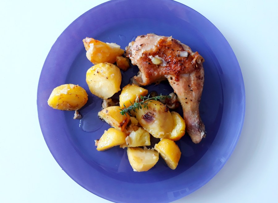 Brambory oloupeme a nakrájíme na čtvrtky. Když jsou brambory nové, není potřeba je loupat, jen očistíme. Dáme je do pekáče, smícháme s olejem, osolíme a opepříme, přidáme nakrájenou cibuli a česnek a zalijeme smetanou. Vše promícháme. Kuřecí čtvrtky omyjeme a očistíme, osolíme a posypeme kořením a položíme je na smetanové brambory. Pod každou čtvrtku položíme snítku tymiánu.