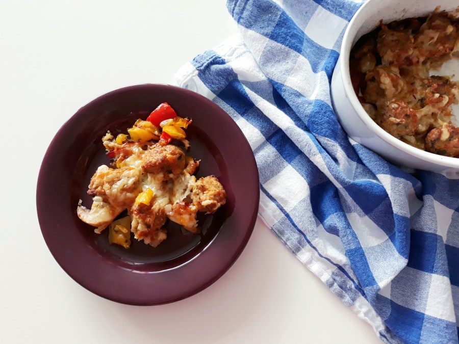 Maso osolíme a opepříme, můžeme přidat nějaké koření dle chuti a fantazie… Uděláme z masa kuličky. Do zapékací misky dáme olej, cibuli nakrájenou na větší kousky, stejně tak i papriku a na to položíme kuličky masa. Pokapeme celé olejem, osolíme a opepříme, posypeme tymiánem.