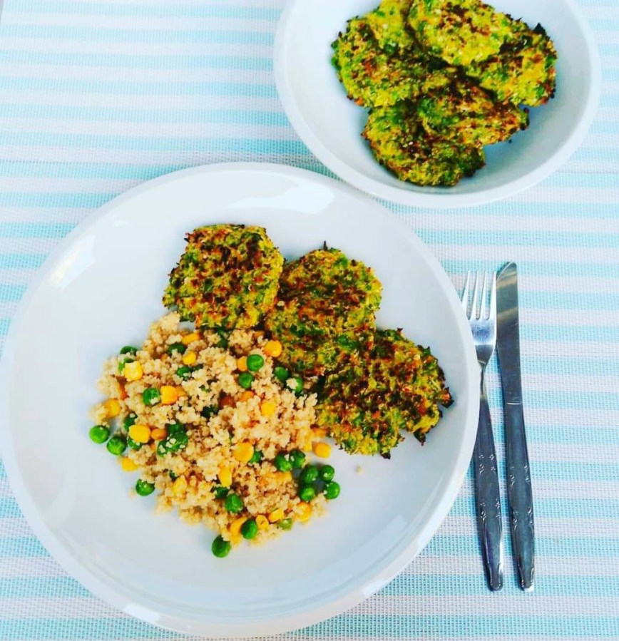 Kapustu a hrášek rozmixujeme. Přidáme nastrouhanou mrkev, sýr, citron. kůru, sůl, pepř a nakonec rozšlehané vejce a vločky. Pořádně zamícháme. Na plech s pečícím papírem dáváme placičky a pečeme v troubě dozlatova. Můžeme opéct i na pánvičce s olejem. Kuskus si připravíme podle návodu a hotový osmahneme na pánvi potřené olejem a zamícháme do něj hrášek s kukuřicí. Ochutíme solí a pepřem.