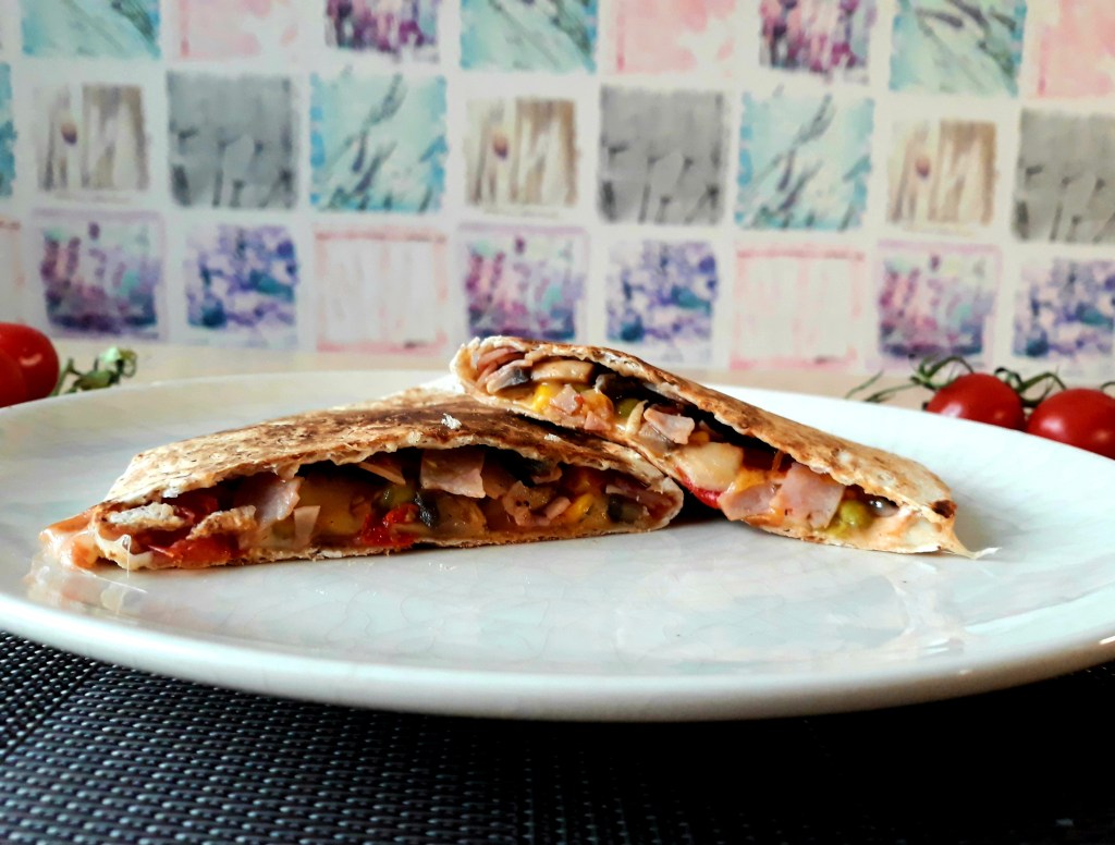 Na trošce oleje si osmahneme na plátky nakrájené žampióny, pak přidáme na nudličky nakrájenou šunku a nakonec rajčátka rozkrojená napůl. Osolíme a opepříme, můžeme přidat koření jaké máme rádi. Hotovou směs dáme na jednu polovinu tortily, na to dáme kukuřice a pak sýry.