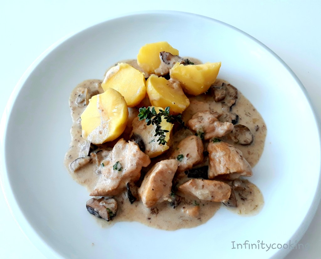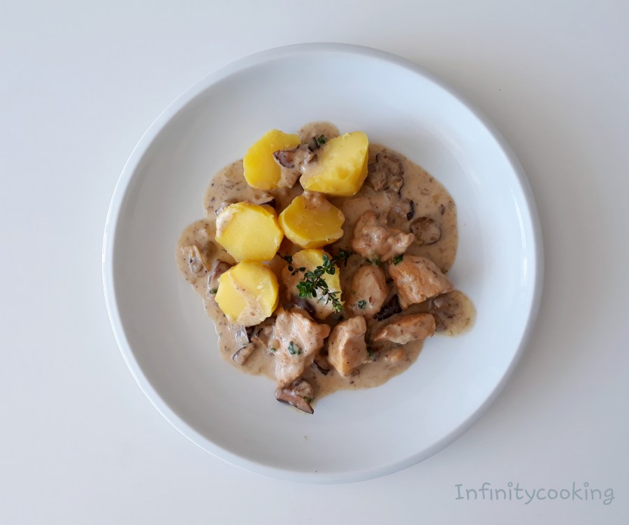 Maso nakrájíme na kostky, cibuli nadrobno. Na oleji osmahneme cibuli a přidáme maso. Opékáme zprudka a až se zatáhne, tak maso vyndáme a dáme stranou. Pak přidáme k cibuli nakrájené houby a osmahneme. Posypeme vše drceným kmínem a necháme chvilku, pak podlijeme vodou nebo vyvarem a osolíme a opepříme. Přidáme maso a dusíme do měkka. Nakonec přidáme smetanu, ve které jsme rozmíchali mouku. Povaříme, případně ještě dochutíme.