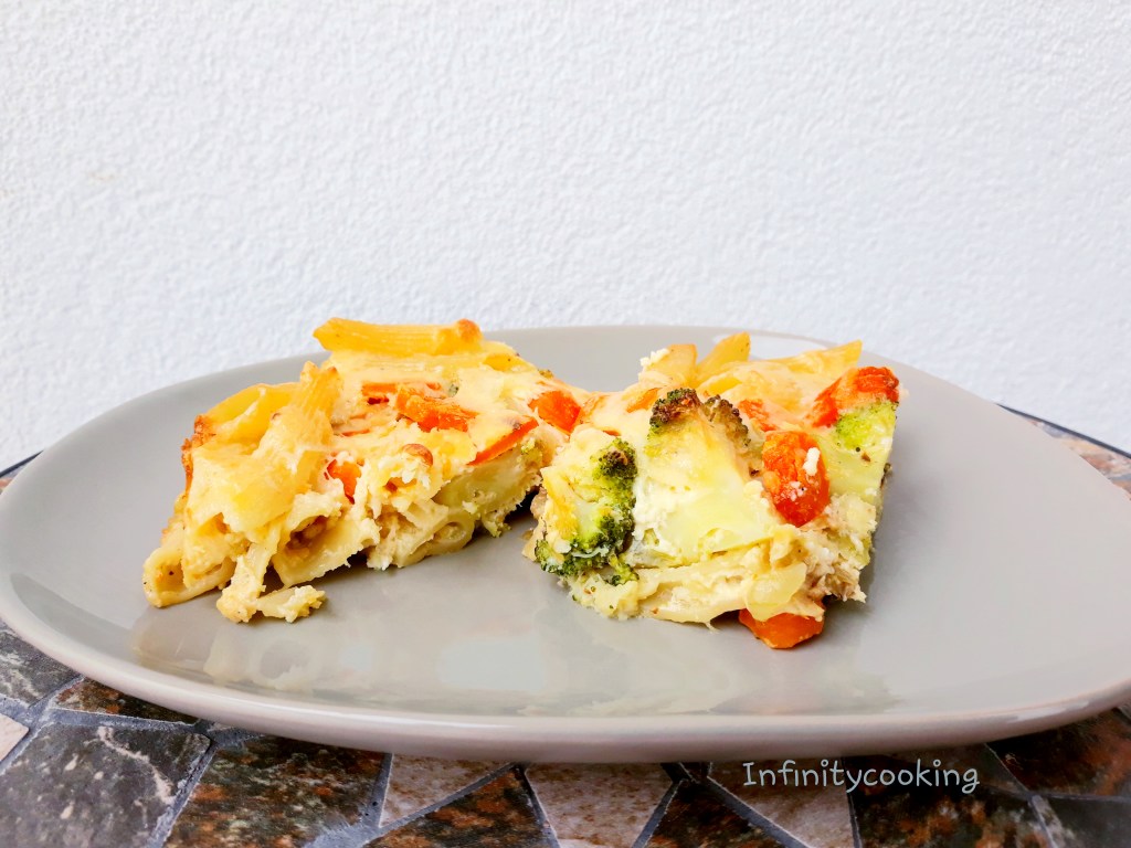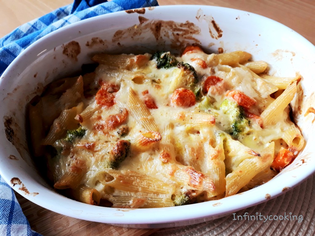 Těstoviny uvaříme dle návodu a scedíme. Na pánvičce na oleji necháme zesklovatět cibuli nakrájenou nadrobno, přidáme mrkev na tenká kolečka. Brokolici rozdělíme na růžičky a uvaříme (necháme jen přejet varem v osolené vodě). Pak přidáme k cibuli a mrkvi i brokolici, promícháme. Těstoviny také dáme ke směsi a zamícháme dohromady, ochutíme solí a pepřem a lahůdkovým droždím a přilijeme asi polovinu smetany. Vejce si rozmícháme spolu se strouhaným sýrem, muškátem a zbytkem smetany. Pekáček nebo keramickou mísu pokapeme olivovým olejem a přendáme tam směs těstovin a zeleniny. Nakonec zalijeme směsí sýra, vejce a smetany. Dáme péct do předehřáté trouby asi na 180°C na zhruba 30 minut.