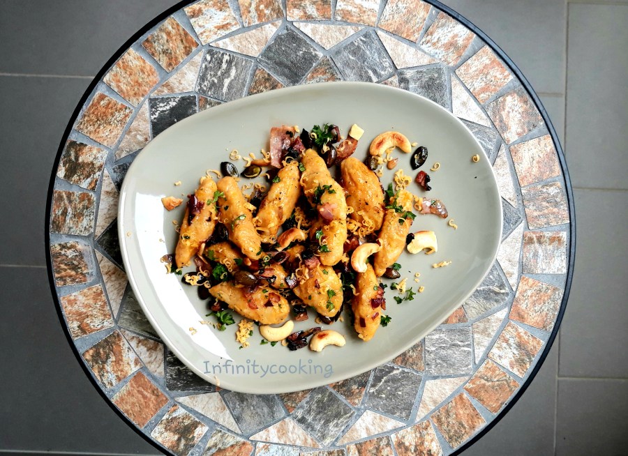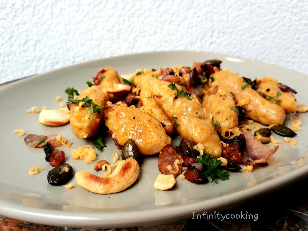 Oloupanou dýni nakrájíme na větší kostky a brambory také. Společně uvaříme doměkka, ale nesmí se rozvařit. Pak scedíme a necháme vychladnout. Studené nastrouháme nahrubo. Přidáme vejce, mouku, sůl a muškát. Uděláme pokud možno nelepivé těsto. Pracujeme rychle, aby nezřídlo, takže pak si těsto rozdělíme na několik dílů a z každého vytvoříme váleček a ukrajujeme stejné kousky a z nich děláme nočky, které dáme do vroucí osolené vody a zamícháme. Jakmile vyplavou, tak povaříme max. 1 minutu a vyndáme. Já jsem si k tomu připravila na pánvi osmaženou cibulku se šunkou a slaninou a s dýňovými semíky a kešu oříšky, noky jsem pak do toho zamíchala. Na talíři posypeme strouhaným sýrem. Určitě by šlo kombinovat i s kuřecím masem.