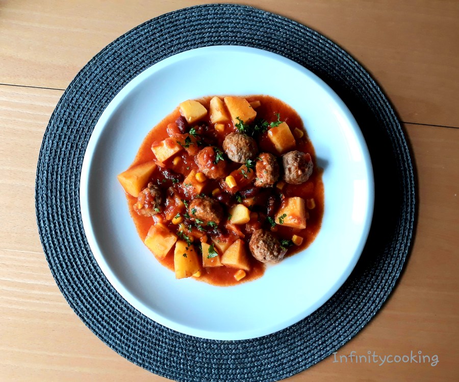Maso osolíme a opepříme a zamícháme. Uděláme z něj kuličky a ty prudce a rychle osmahneme na oleji, vyndáme z hrnce a dáme stranou. Cibuli nakrájíme nadrobno a dáme do oleje po masových kuličkách. Necháme zesklovatět, pak přidáme plechovku rajčat, masové kuličky a na kostičky nakrájené brambory, koření a malinko podlijeme. Zakryjeme a dusíme doměkka.