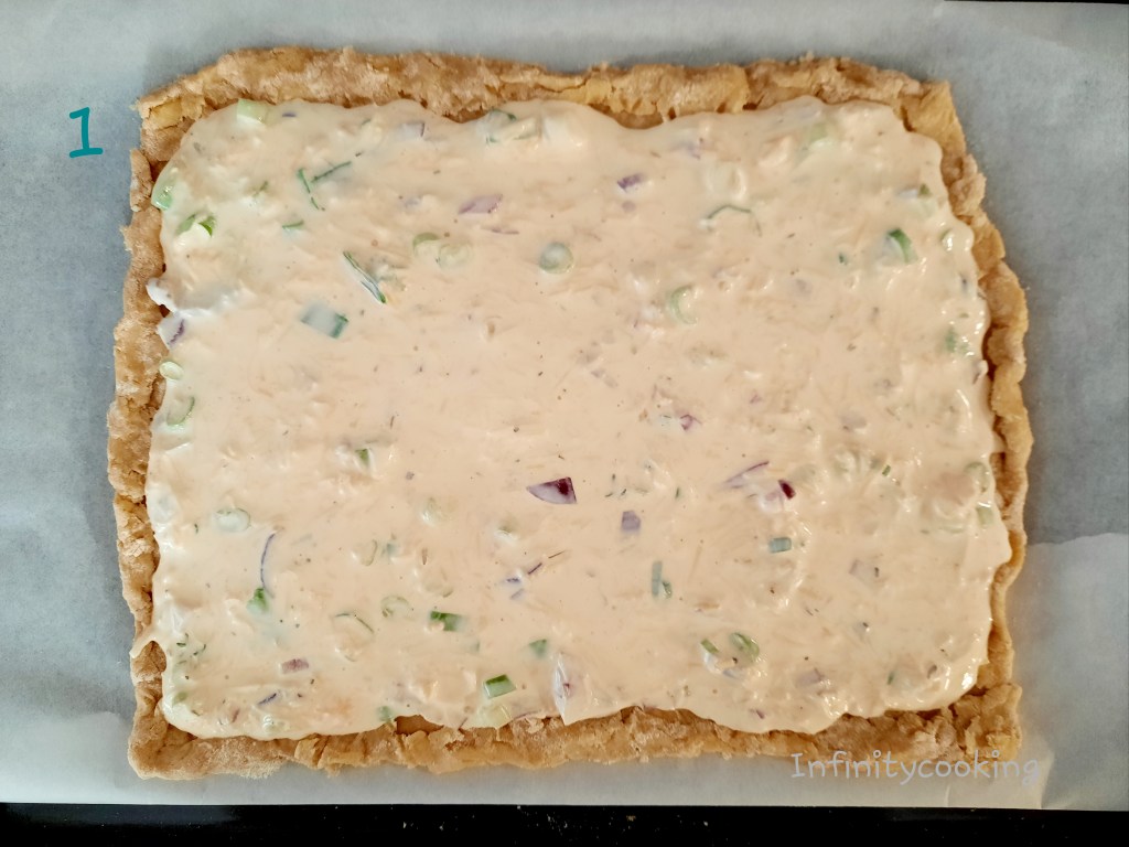 Nejprve si připravíme těsto spojením všech surovin. Pak těsto zabalíme do folie a dáme na chvíli do lednice. Mezitím si uděláme tu výbornou sýrovou náplň do koláče. Do mísy nastrouháme najemno tvrdý sýr. Přidáme lučinu, vejce, mléko, nasekanou cibuli a ochutíme. Vychladlé těsto si rozválíme na asi velikost plechu, může být menší a přendáme na pečící papír. Uděláme u těsta trochu vyšší okraj, aby nám náplň hned nevytekla. Pak tedy tuto náplň můžeme nalít na těsto.