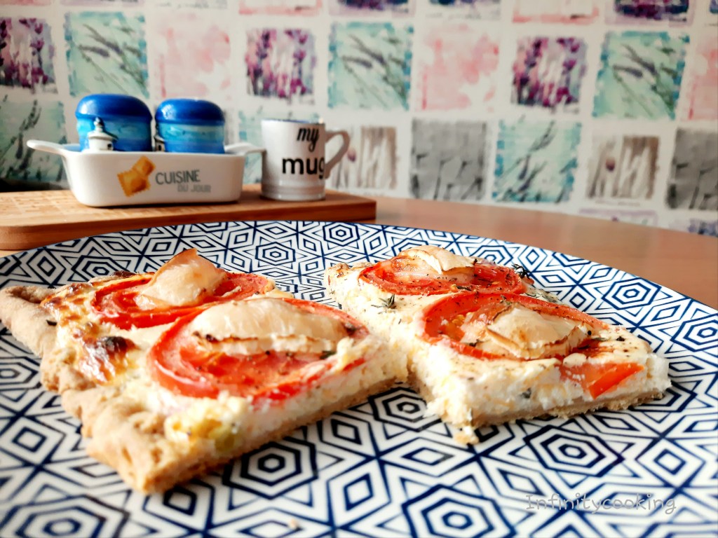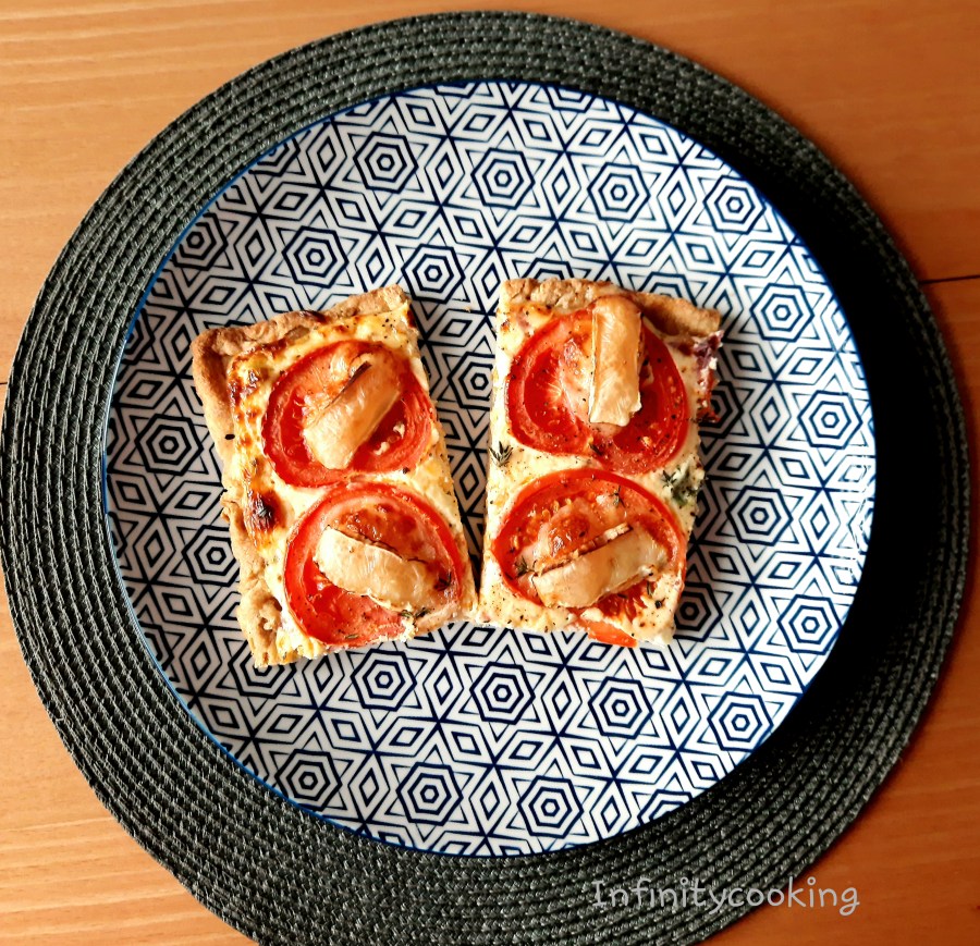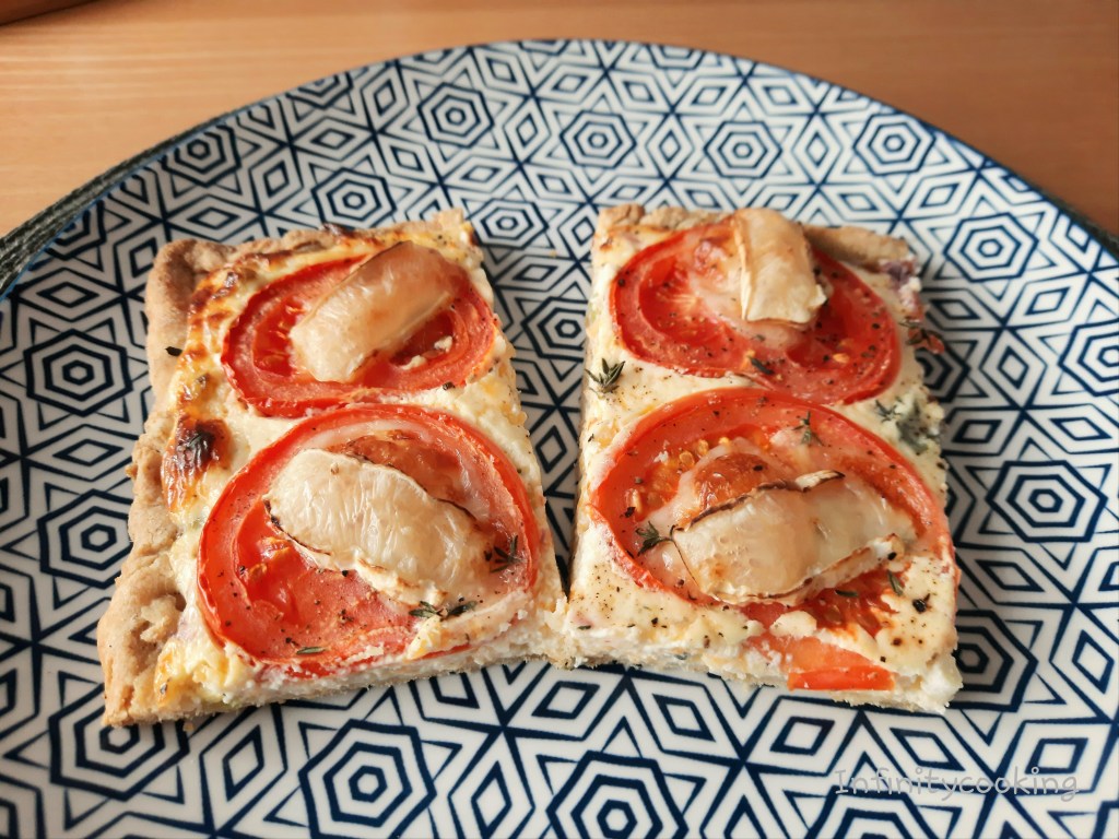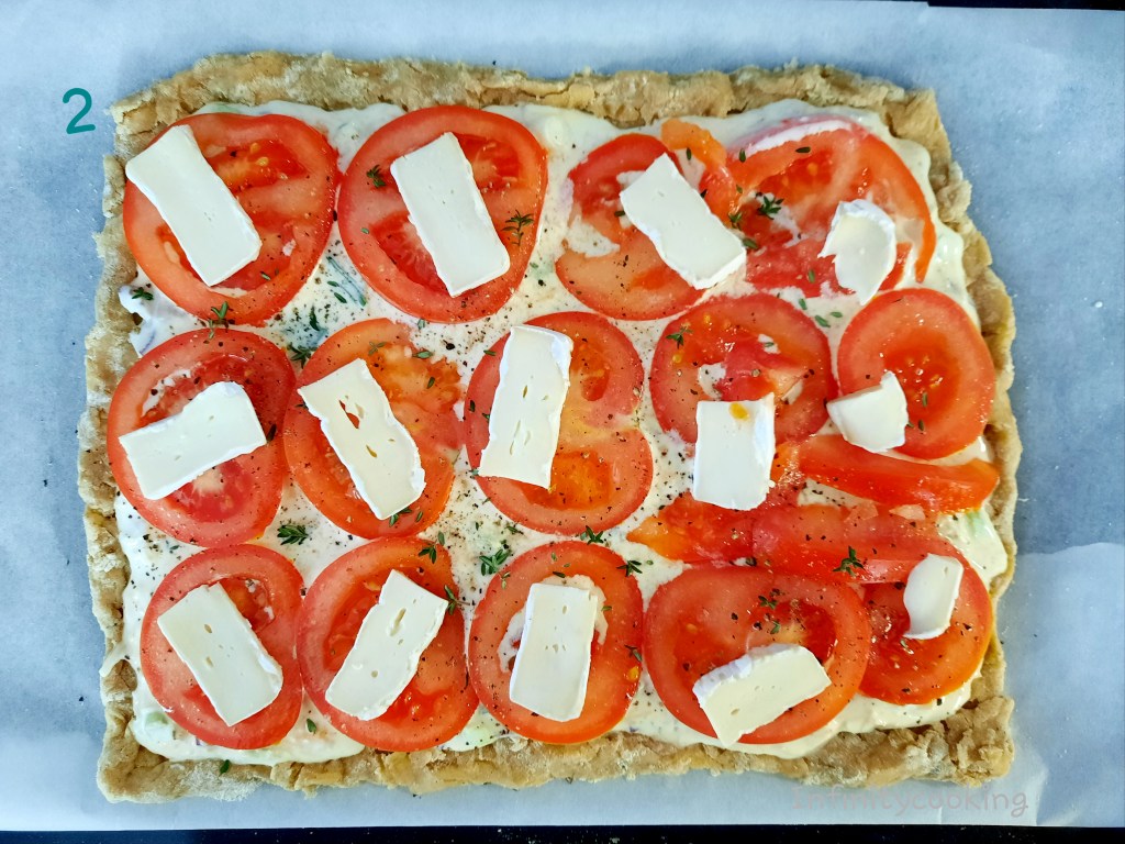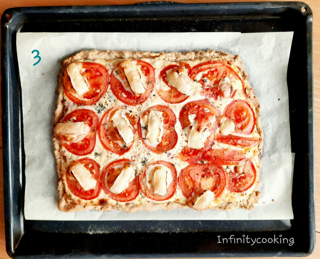 Potom si omyjeme rajčata a nakrájíme na plátky, stejně tak hermelín. Plátky rajčat poklademe celý povrch, na to pak dáme plátky hermelínu. Nakonec ještě dochutíme (sůl, pepř, tymián).