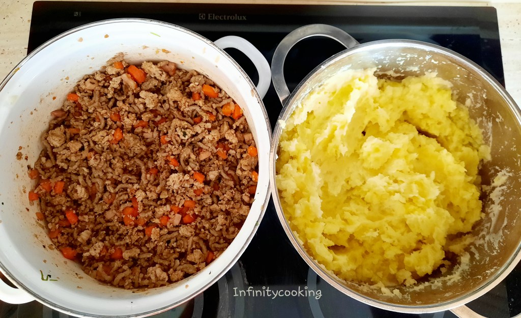 Očistíme brambory a uvaříme jako na kaši. Potom do nich přidáme máslo a trochu mléka a rozšťoucháme. Dáme stranou. Na oleji osmahneme nadrobno nakrájenou cibuli a slaninu, přidáme mleté maso a opékáme. Mrkev očistíme a nakrájíme na kolečka, dáme k masu a okořeníme. Opékáme dozlatova, trochu podlijeme a chvíli dusíme.