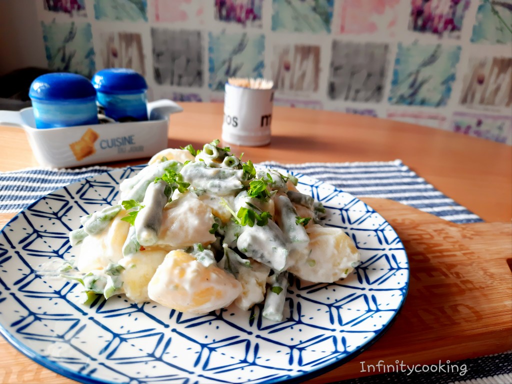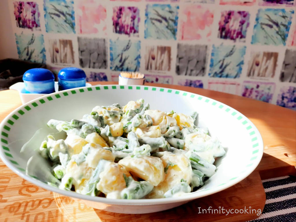 Brambory uvaříme ve šlupce doměkka. Zelené mražené fazolky spaříme ve vroucí osolené vodě také doměkka. Smícháme si olivový olej, citronovou šťávu, sůl, cukr a smetanu na šlehání. Do mísy dáme uvařené, oloupané brambory, které jsme nakrájeli na kousky, přidáme fazolky, hrst sekané petržele a promícháme. Nakonec do toho zamícháme kysanou smetanu a směs, kterou jsme si smíchali. Důkladně promícháme s bramborami a fazolkami. Můžeme případně ještě dochutit.