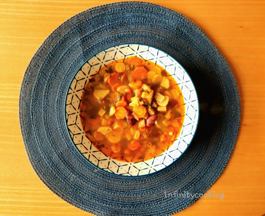 Na oleji osmahneme cibuli nakrájenou nadrobno. Přidáme postupně kořenovou zeleninu nakrájenou na kolečka a kostičky. Prudce osmahneme, zasypeme paprikou a pak podlijeme vodou. Přidáme ostatní koření, sůl a pepř, snítky tymiánu a vaříme doměkka. Když je zelenina hotová, vyndáme tymian ven, přidáme čočku, fazole, bylinky a dochutíme. Povaříme ještě pomalu do změknutí čočky.