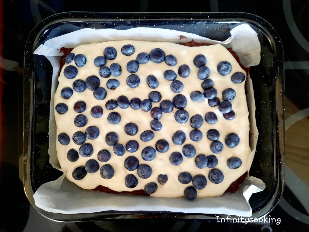 Rozpustíme si v mikrovlnce čokoládu a kokosový olej a smícháme. Přidáme vejce, ořechové máslo, kakao a zbytek surovin na těsto. Těsto je hustší, nalijeme (rozetřeme) do pekáčku na pečící papír. Připravíme si náplň a to tak, že smícháme všechny suroviny (tvaroh, sýr…). Opatrně natíráme na těsto. Navrch pak poklademe ovoce a dáme péct do vyhřáté trouby na 160° C. Pečeme pozvolna dokud není hotovo. Poznáte podle špejle.