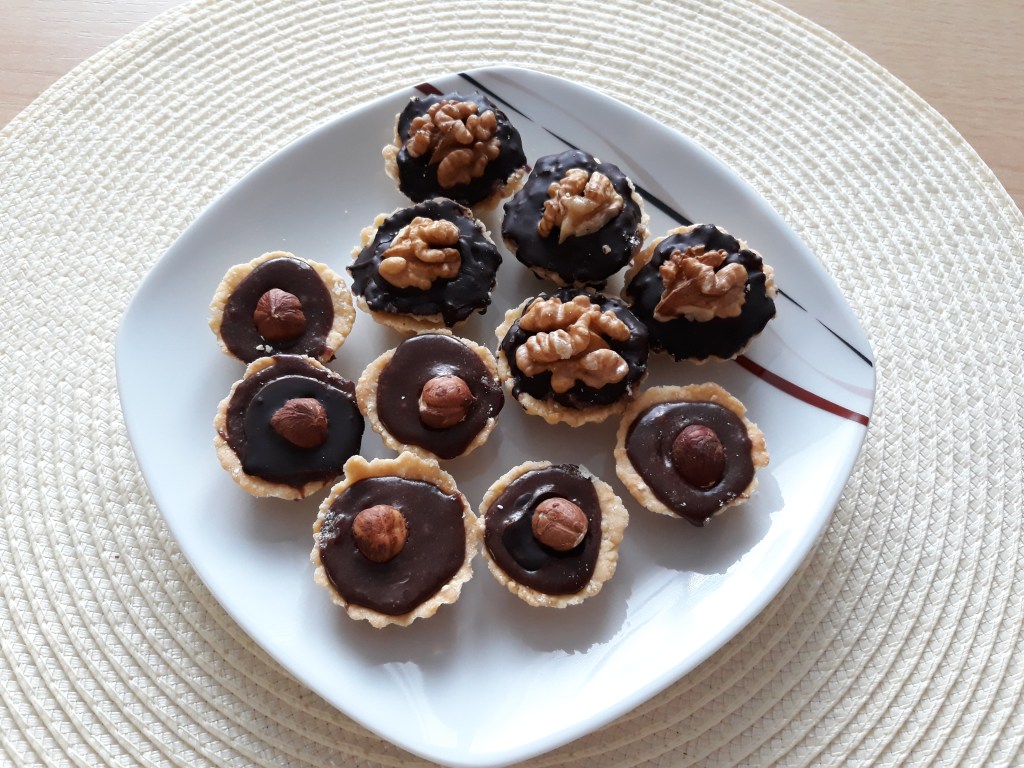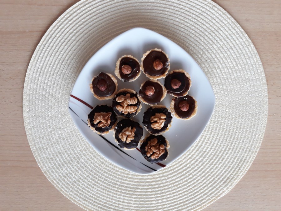 Hotové a vychlazené těsto vyndáme z lednice a plníme do košíčků, které pak pečeme dozlatova v troubě. Vychladlé potom můžete plnit nejdříve ořechovou náplní, na to kousek máslové náplně a nakonec zalijeme čoko polevou. Zdobit můžete vlašákem nebo jinými ořechy.