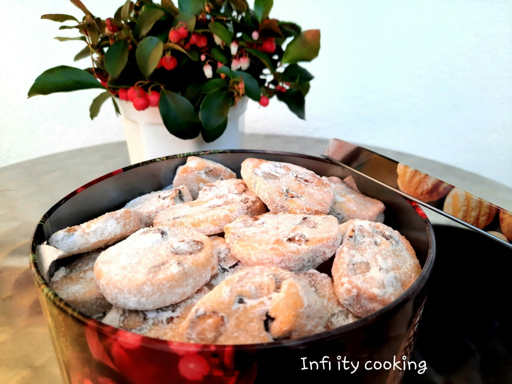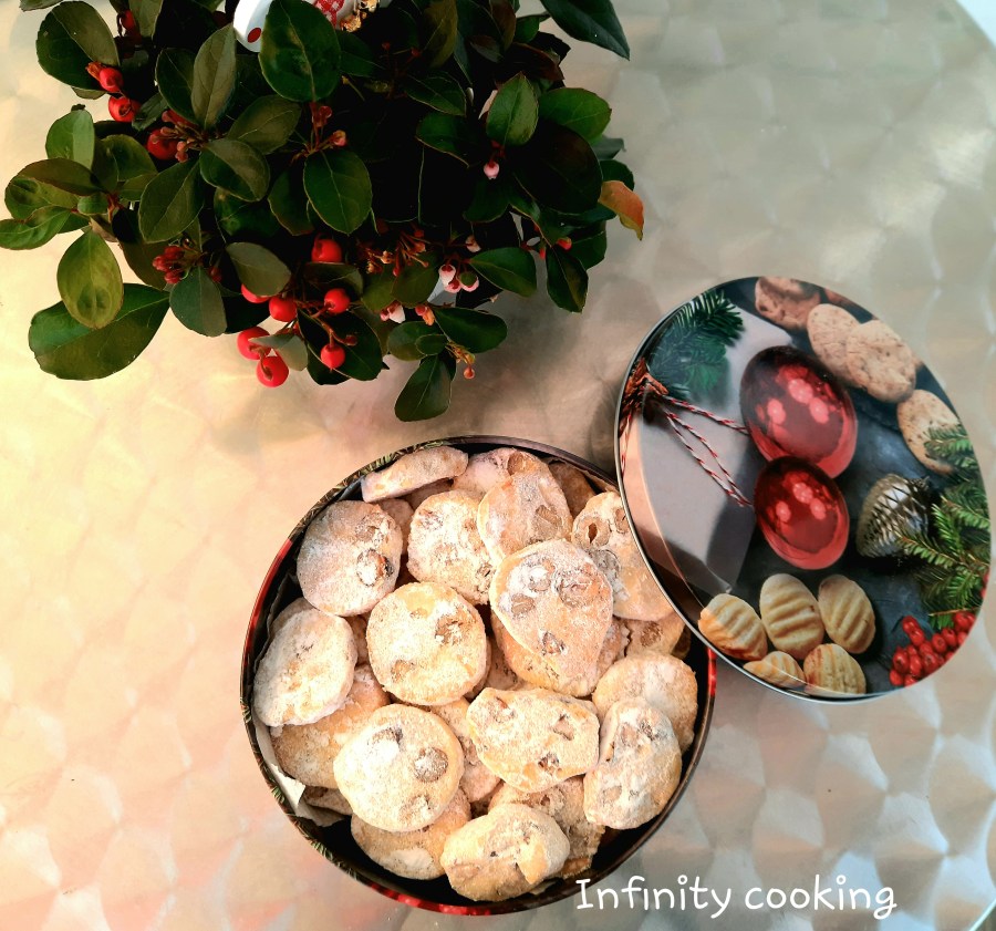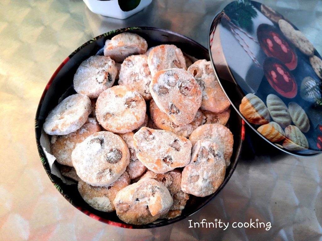 Celé ořechy dáme do mísy a zalijeme je studenou vodou. Necháme máčet asi půl hodiny – hodinu. Z ostatních surovin si začneme připravovat těsto, do kterého pak osušené ořechy přidáme. Vypracujeme a uděláme si z něj malé válečky o průměru asi 3 cm, zabalíme je do folie a dáme do chladu, klidně do druhého dne. Potom těsto vezmeme a nakrájíme z něj plátky asi 0,5 cm silné. Dáme je na pečící papír na plech a pečeme na 180C asi 10 minut. Ještě teplé obalujeme v moučkovém cukru…