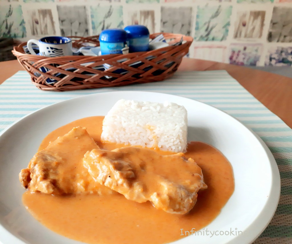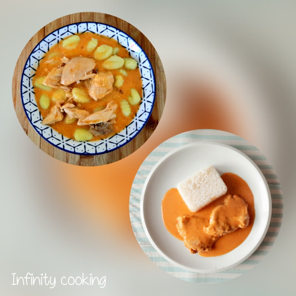 Pokud zvolíte variantu s kuřetem, tak to nejdříve musíme uvařit. Tím nám vznikne i ten vývar, který pak na omáčku použijeme. Uvařené kuře obereme a větší kousky použijeme do omáčky. Pokud je masa hodně, tak nechávám ty malé kousíčky stranou a pak udělám ještě polévku. Pokud si vyberete nějaké masové plátky, tak jen lehce naklepat, osolit a opepřit. Pak tyto plátky zprudka opečeme na oleji z obou stran, podusime doměkka a dáme stranou. No a teď můžeme začít s omáčkou. Na oleji osmahneme nadrobno nakrájenou cibuli a pak přidáme najemno nastrouhanou mrkev. Zprudka opekáme, pokud se přichytává, tak malinko podlijeme. Přidáme červenou sladkou papriku, určitě alespoň 1PL, podle množství omáčky, bobkový list a nové koření, osolíme a chvilku necháme. Pak zalijeme vývarem a podusíme doměkka. Nakonec vše rozmixujeme a dochutíme solí a citronovou šťávou. Zjemníme smetanou a pokud je omáčky hodně, zahustíme moukou. Do hotové omáčky vložíme maso a povaříme chvíli.