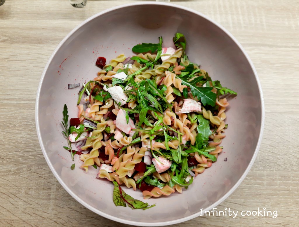 Těstoviny uvaříme, scedíme a necháme vychladnout. Cibuli si nakrájíme na tenké proužky, kuřecí maso natrháme nebo nakrájíme na kousky, sýr nakrájíme na kostičky a vše smícháme spolu s těstovinami. Přidáme listy salátů a promícháme. Zakápneme olivovým olejem a citronovou šťávou a nakonec přidáme řepu. Lehce zamícháme.