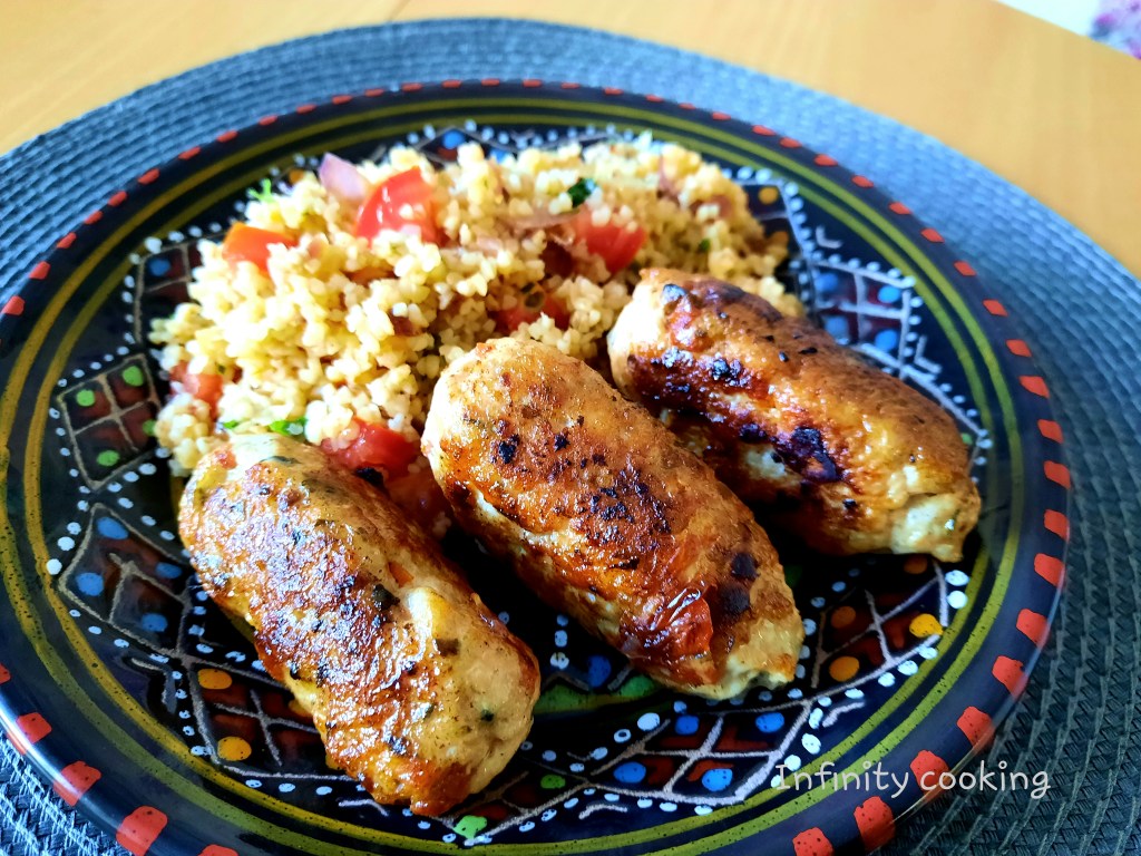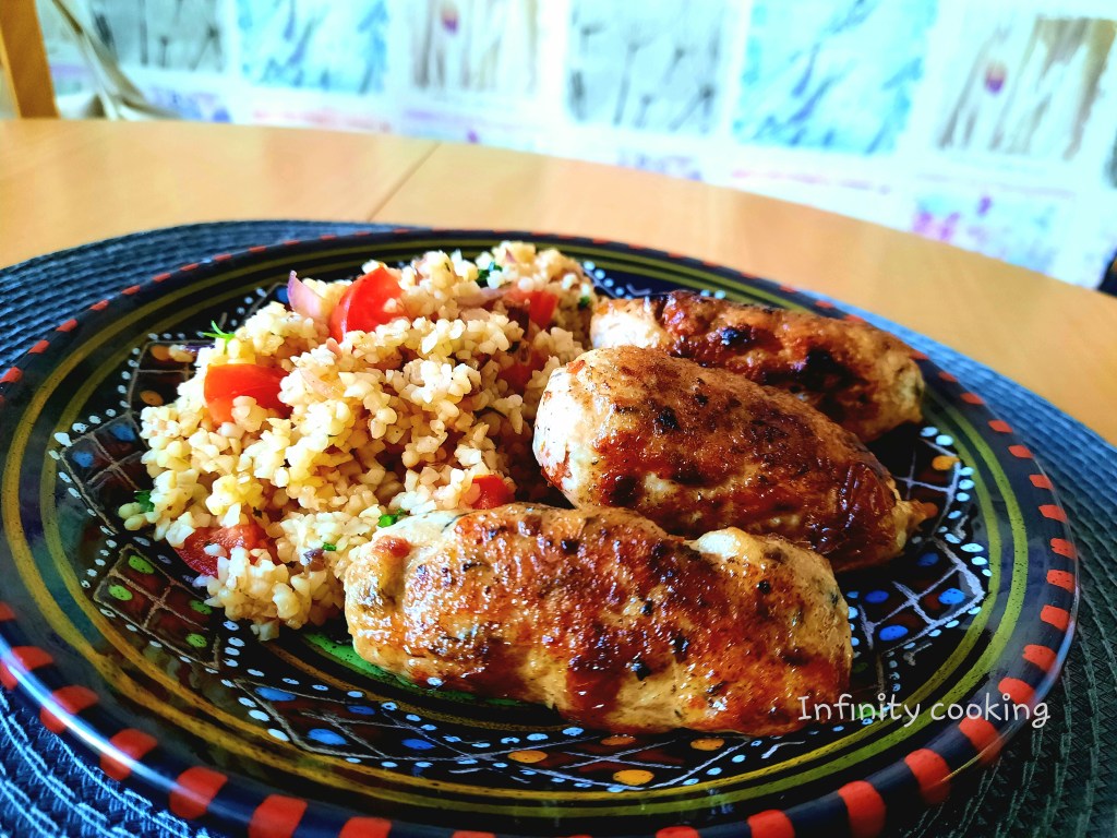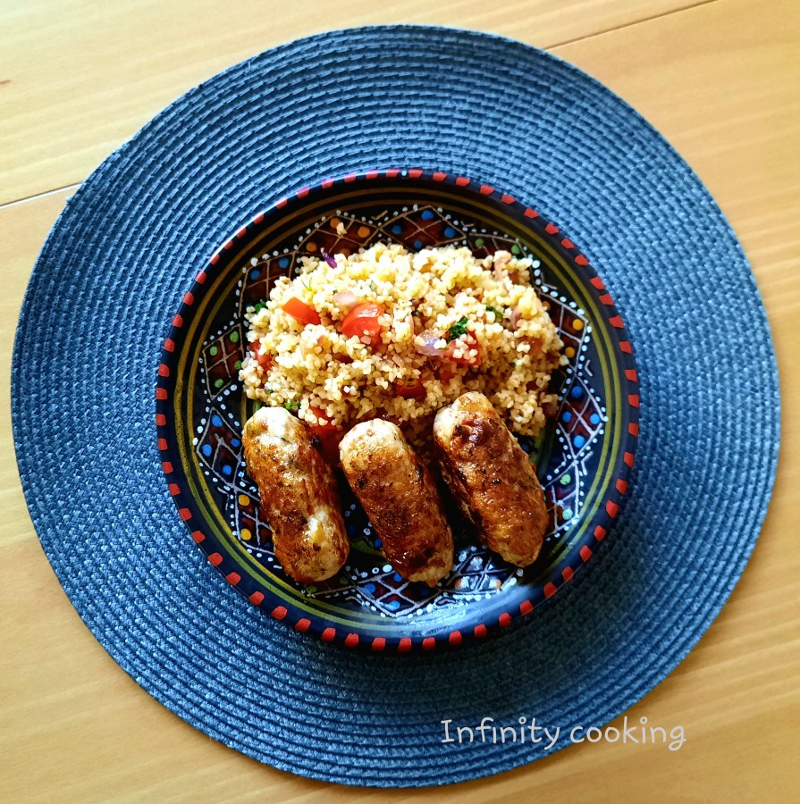 Bulgur uvaříme dle návodu. Na pánev kápneme trochu olivového oleje a masové šišky opečeme, hotové dáme stranou. Na pánev dáme nasekanou cibulku a osmahneme, přidáme na kostičky nakrájené rajče a chvíli podusíme. Do pánve vmícháme bulgur, osolíme, opepříme a přidáme nasekané bylinky. Promícháme a můžeme podávat.