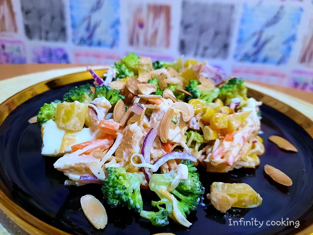 Brokolici rozebereme na malé růžičky, omyjeme a vložíme do vroucí vody, necháme jen přejet varem a pak vyndáme a schladíme. Dáme pak do mísy, přidáme ostatní zeleninu a nakrájené maso a promícháme. Uděláme si dresink smícháním surovin a přidáme ho k zelenině, promícháme. Dále přimícháme do salátu nastrouhaný sýr a vložíme pokrájené vejce. Nakonec vmícháme upražené plátky mandlí.