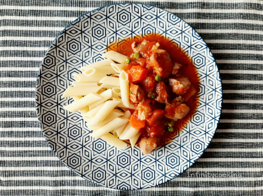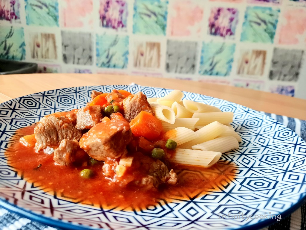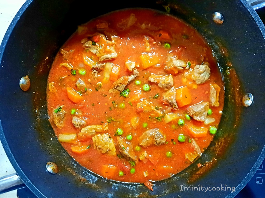 Maso očistíme a nakrájíme na kostky. Maso a zprudka opečeme na oleji, necháme zatáhnout a po chvíli vyndáme z hrnce. Do výpeku přidáme nadrobno nakrájenou cibuli a nadrobno nakrájený česnek. Mrkev a celer očistíme a nakrájíme na kolečka a kostičky a přidáme po chvíli k cibuli do hrnce, opékáme společně. Pak přidáme i maso, rajčata a pyré. Vše promícháme a okořeníme a ochutíme. Trochu podlijeme pokud je potřeba a pozvolna dusíme doměkka. Když je maso i zelenina hotové, přidáme mražený hrášek a zelenou petrželku. Případně ještě dochutíme. Podáváme nejlépe s těstovinami.