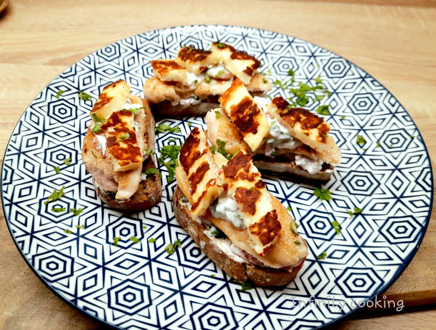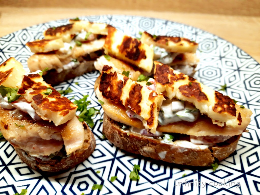 Rajčátka a cibulku nakrájejte a smíchejte spolu s kysanou smetanou, osolíme a opepříme. Kuřecí plátky osolíme a prudce osmahneme na pánvi, stejně tak haloumi a plátky chleba. Pak už jen vrstvíme dle chuti. Na každý plátek chleba dáme salátek, na to kuřecí maso a navrch haloumi. Posypeme zelenou petrželkou a můžeme podávat.