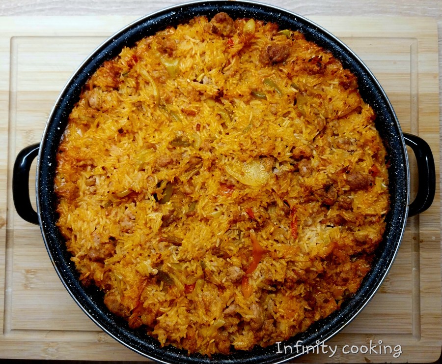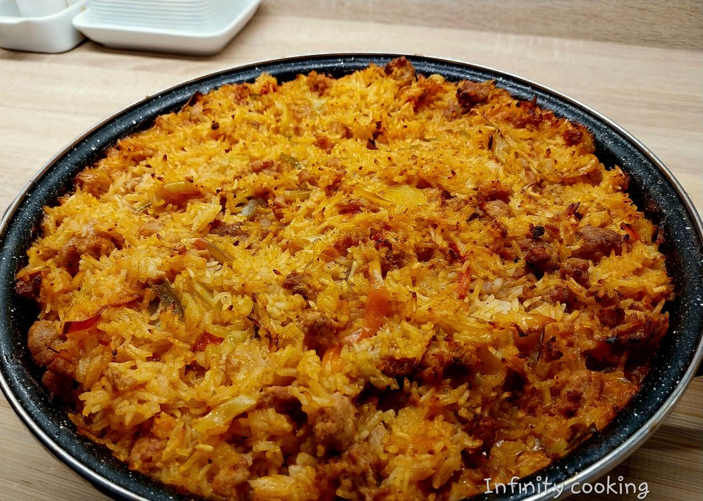 Nejdříve na oleji osmahneme cibuli nakrájenou nadrobno, pak přidáme mleté maso a opékáme dokud se nezatáhne. Osolíme, opepříme, přidáme červenou papriku. Do toho dáme celou sklenici leča a kečup. Důkladně promícháme a necháme chvilku povařit. Pak přisypeme omytou rýži a chvíli mícháme. Dochutíme. Zalijeme vývarem a dáme péct do vyhřáté trouby na 180 °C.